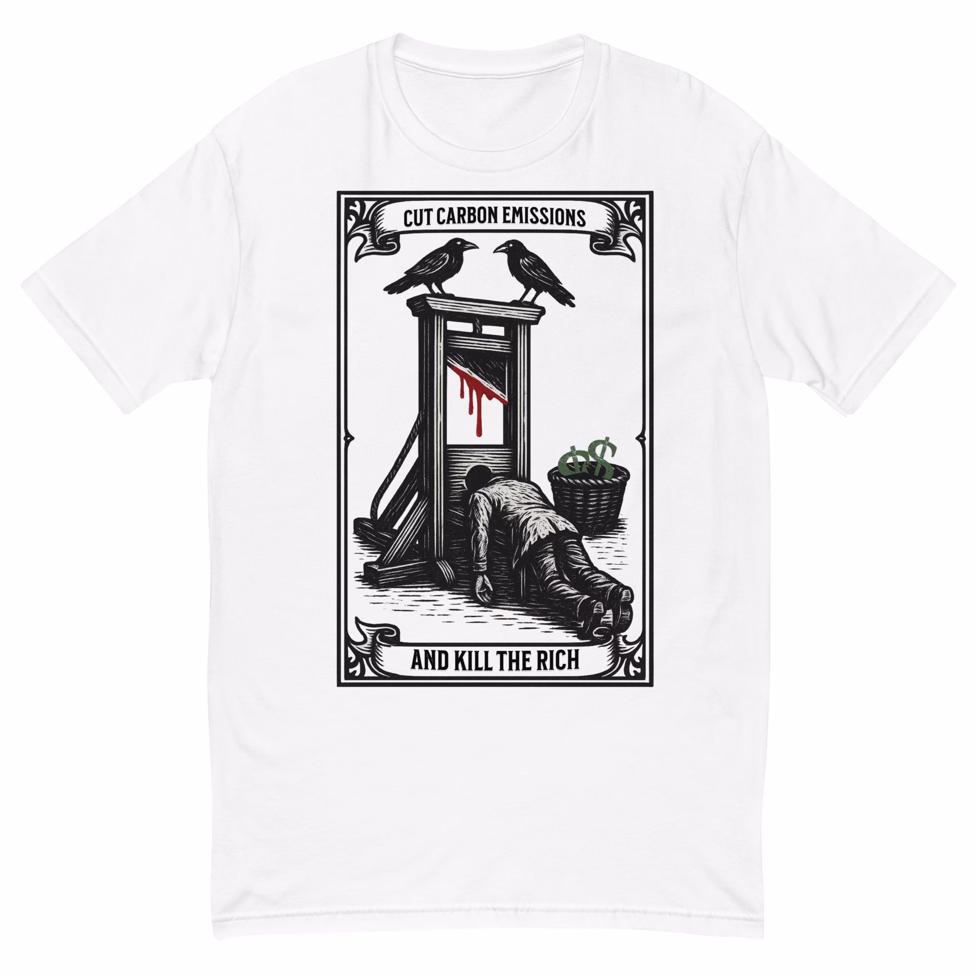 This one’s not subtle and that’s the point. Featuring a vintage protest-style design with guillotine, crows , and unapologetic message “Cut Carbon Emissions… and Kill the Rich”, this fitted tee is for those who are done playing nice with corporate greenwashing.