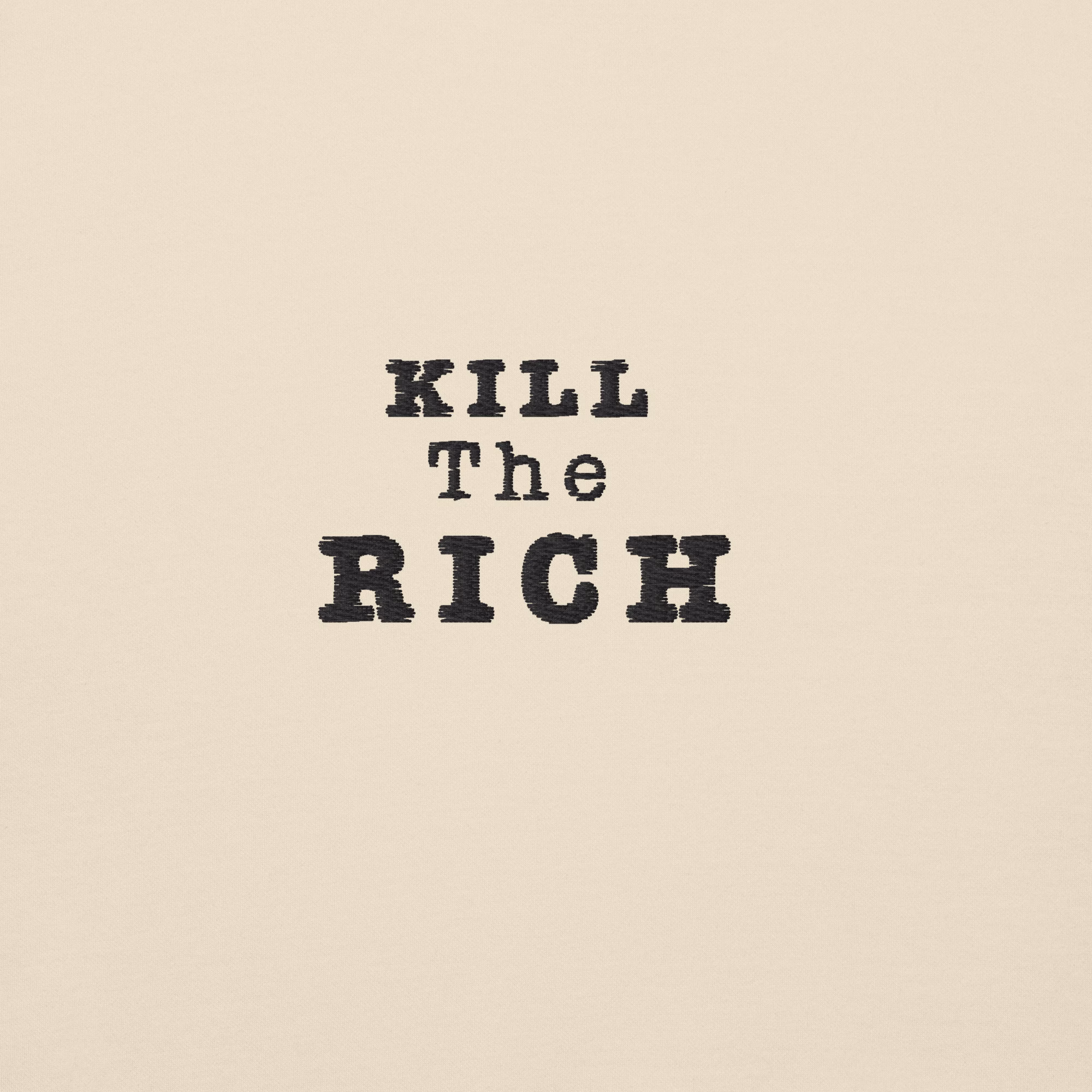 This premium hoodie comes embroidered with “Kill the Rich” on the front and features a full back graphic that makes your stance crystal clear. Whether you’re layering up for protests or just keeping warm while plotting the downfall of late-stage capitalism, this one brings the comfort and the message.